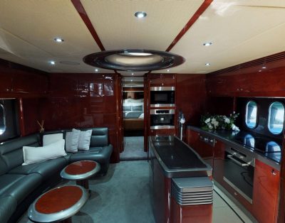 Enter the spacious open plan saloon through the panoramic automated glass doors and bask in the ultimate luxury. Unwind and entertain in equal measure in this special place, complete with a concealed bar that is perfect for enjoying a cocktail while taking in the breathtaking surroundings. From the saloon, guests can access two staircases that lead to the lower deck.